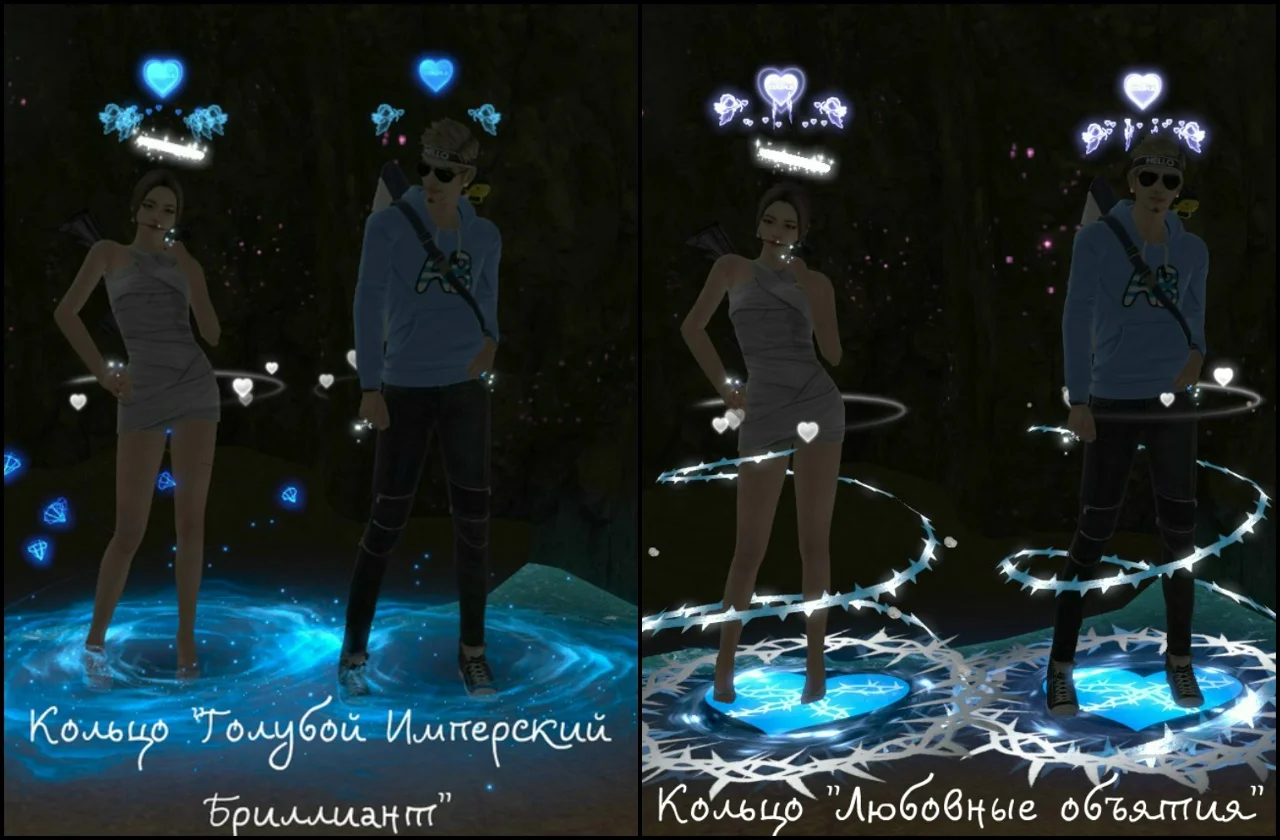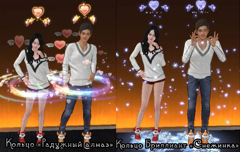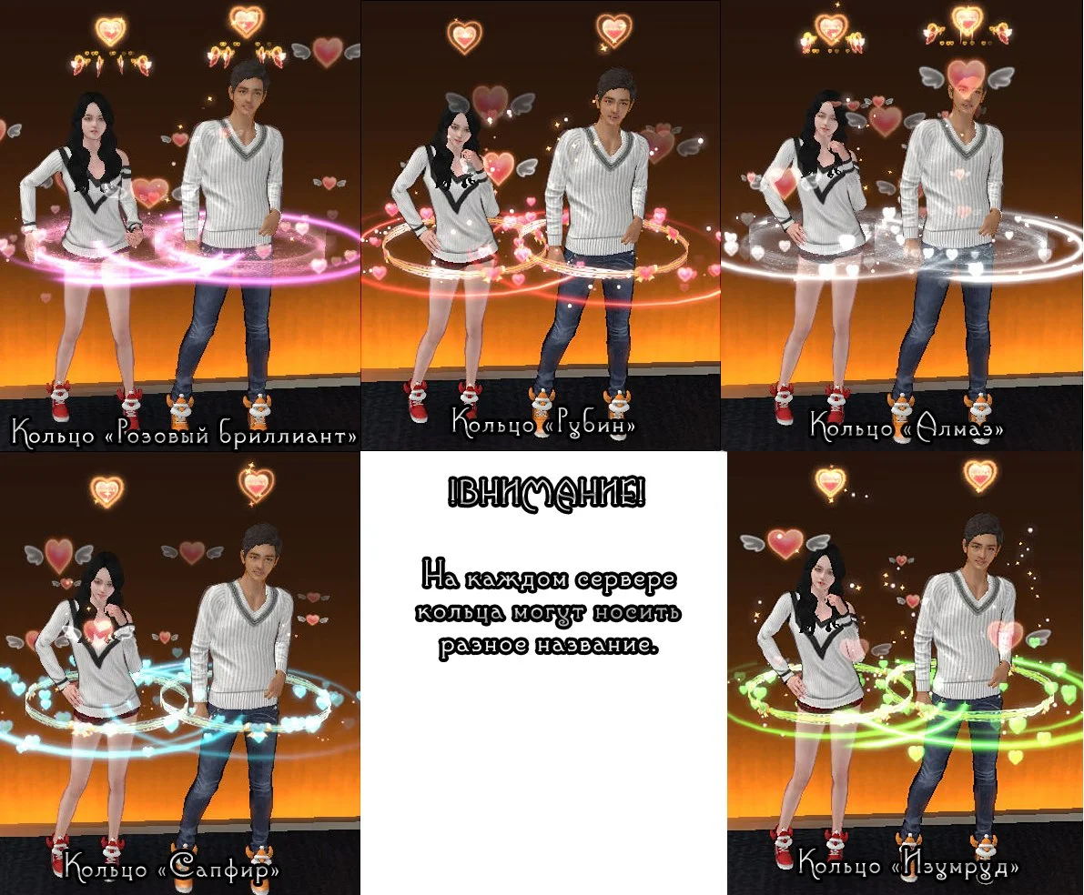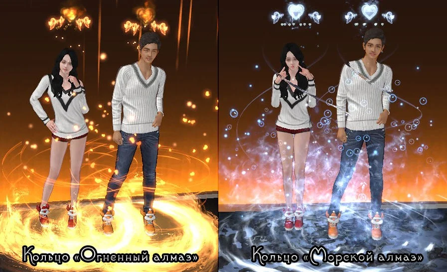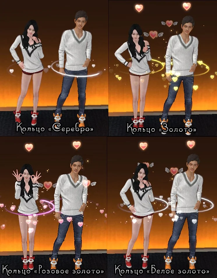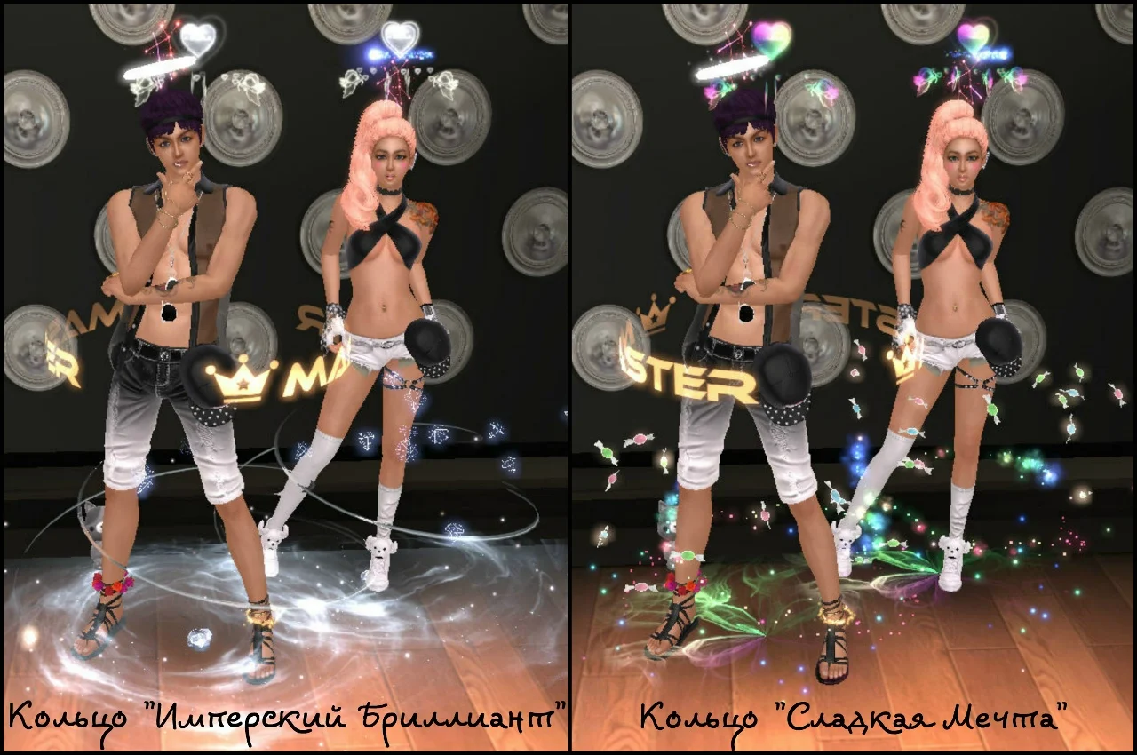 В зависимости от уровня пары вы можете менять кольца (4 уровень, 8 уровень, 10 уровень). Каждое кольцо имеет свою ауру и в дальнейшем приобретается в парном магазине. Так же кольца влияют на количество очков опыта пары за танцы. При наличии разных колец, вы всегда можете сделать активным то кольцо, которое хотите, таким образом сменив и ауру вашей пары. Для этого необходимо войти в меню пары - кольца.