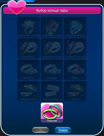 В данном меню подсвечиваются только те кольца, которые у вас в наличие. Новое кольцо передается так же как и при создании пары.