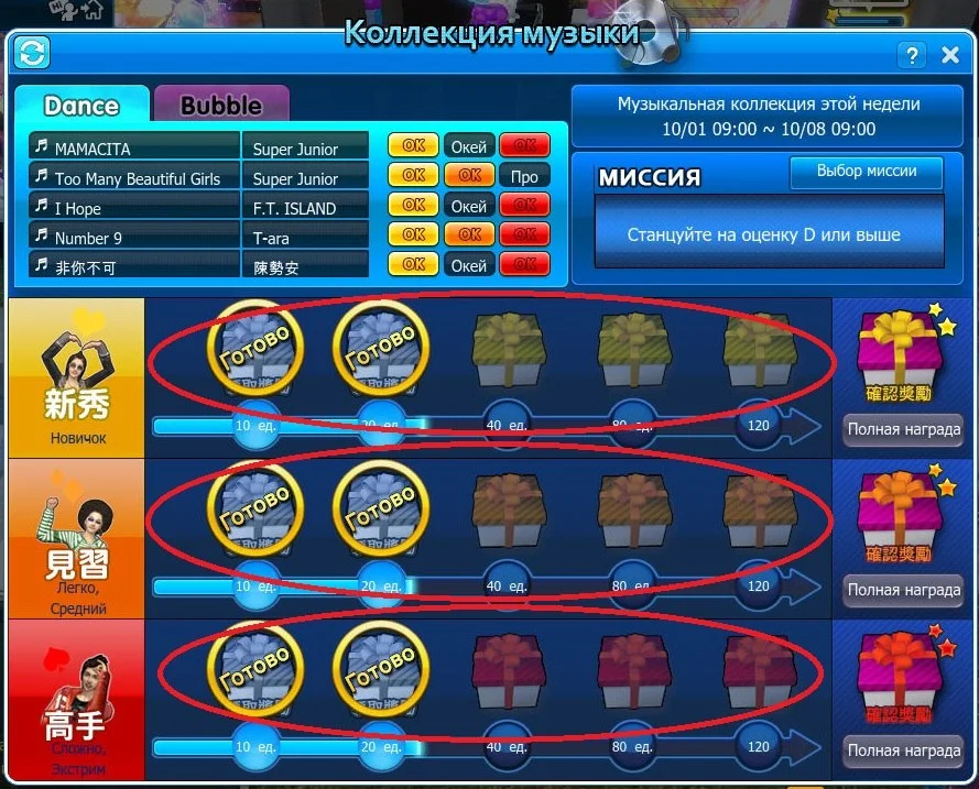 Каждую песню необходимо сыграть на 3 режимах и на 3 уровнях: