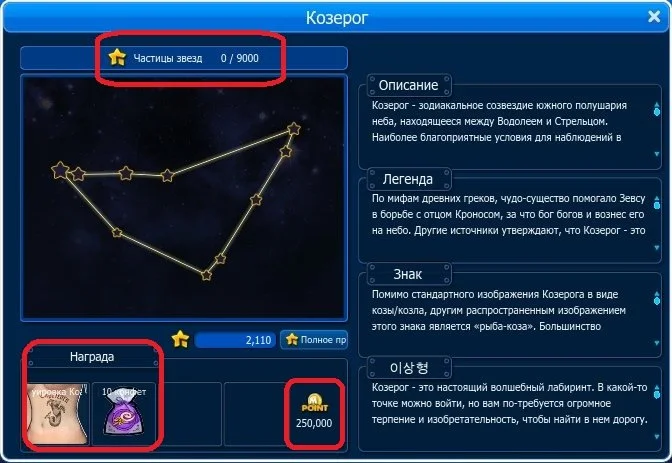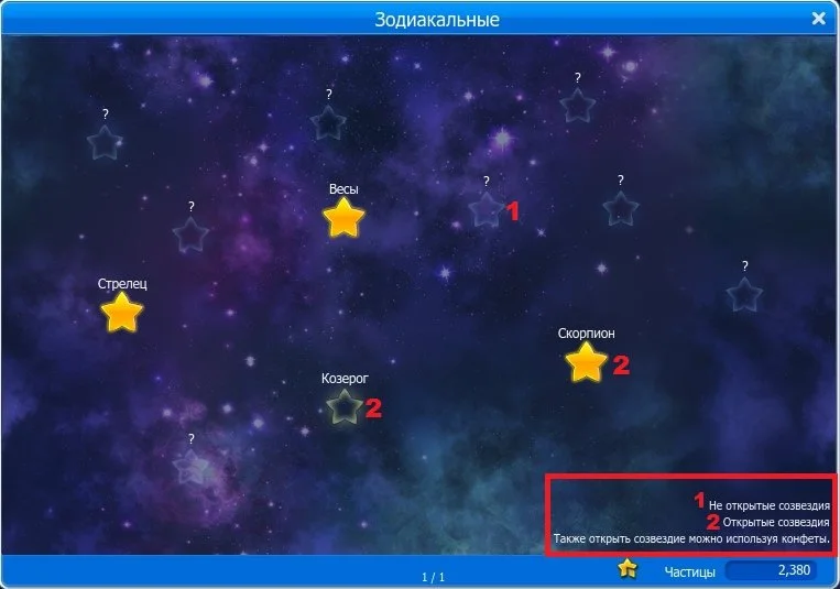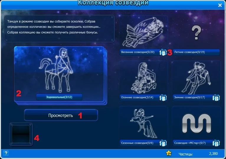 | • Нажимаем на “Коллекцию” (кубок) • Выбираем раздел “Созвездия” (Девушку) ![]() • В открывшемся окне вы увидите группы созвездий и ваше количество частиц на текущий момент ![]() 1. Просмотр всех существующих созвездий. 2. Зодиакальные созвездия (за сбор всей группы нет специального подарка) 3. Подарок за сбор всей группы (можно посмотреть нажав на значок) 4. Если купить в магазине телескоп за 9 конфет, вы будете получать за танцы в режиме созвездия двойное количество частиц. Телескоп будет отображаться в данном слоте. • Если вы зайдете в одну из групп, вы увидите какие созвездия в нее входят. Чтобы зайти в каждое созвездие и посмотреть количество требуемых частиц, необходимо собрать это созвездие в танце, или открыть за конфеты. ![]() • Выбрав и открыв созвездие вы увидите требуемое количество звезд и подарок за его сбор. ![]() Основные награды: [Награды режима “Созвездия” ] |