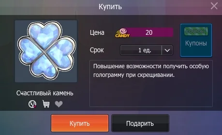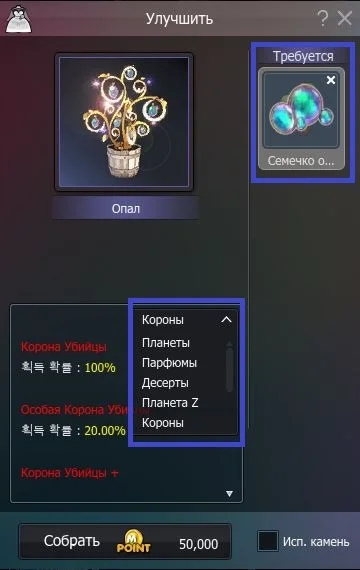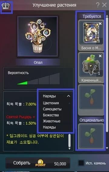 В окне описан шанс получения растения. В зависимости от того, какие камни, карты и прочее используются. Если вы используете камни\карты текущего месяца, то шанс создания намного выше. Для того, чтобы повысить шанс, можно использовать Счастливый камень и Звёздные фрагменты месяца.