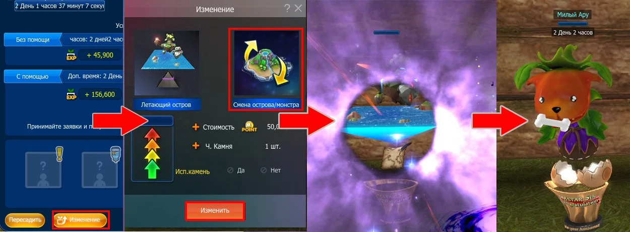 Вы помещаете смены во второй слот и жмете «Изменить». Если вы изменяете голограмму, то она может измениться в любую карту и голограмму любого сезона. Не важно какую голограмму вы используете. С островами и монстрами ситуация иная: Вы можете изменить остров и получить монстра!. Стоит заметить, что при изменении особый голограмм, монстров и островов они будут меняться на растение другого сезона, соответствующего месяцу этого растения. Так, например, при смене Острова НЛО вы получите Жадного Пьюпио и наоборот; а при смене особой голограммы Персей получится голограмма Рак и т.д.