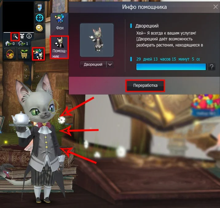 2. Открыть окно переработки в доме можно несколькими способами: нажав на дворецкого, нажав на специальную кнопку переработки в окне садовода, нажав специальную кнопку в инфо помощника.